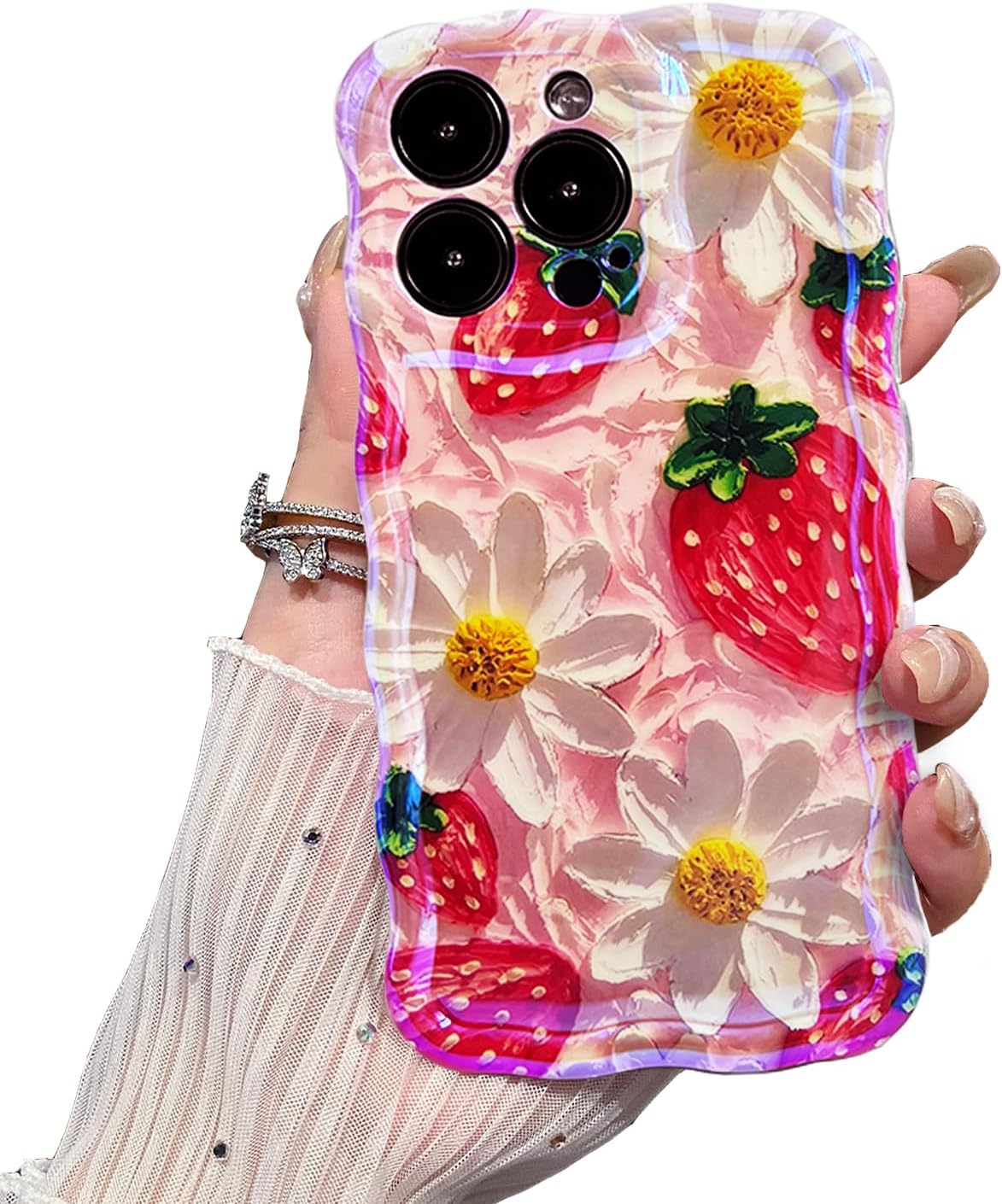 Case for iPhone 15 Pro Max,Exquisite Colorful Retro Oil Painting Flower Stylish Glossy Wave Frame Phone Cover,Soft Durable Shockproof Protection Camera Protective Case for Women Girl